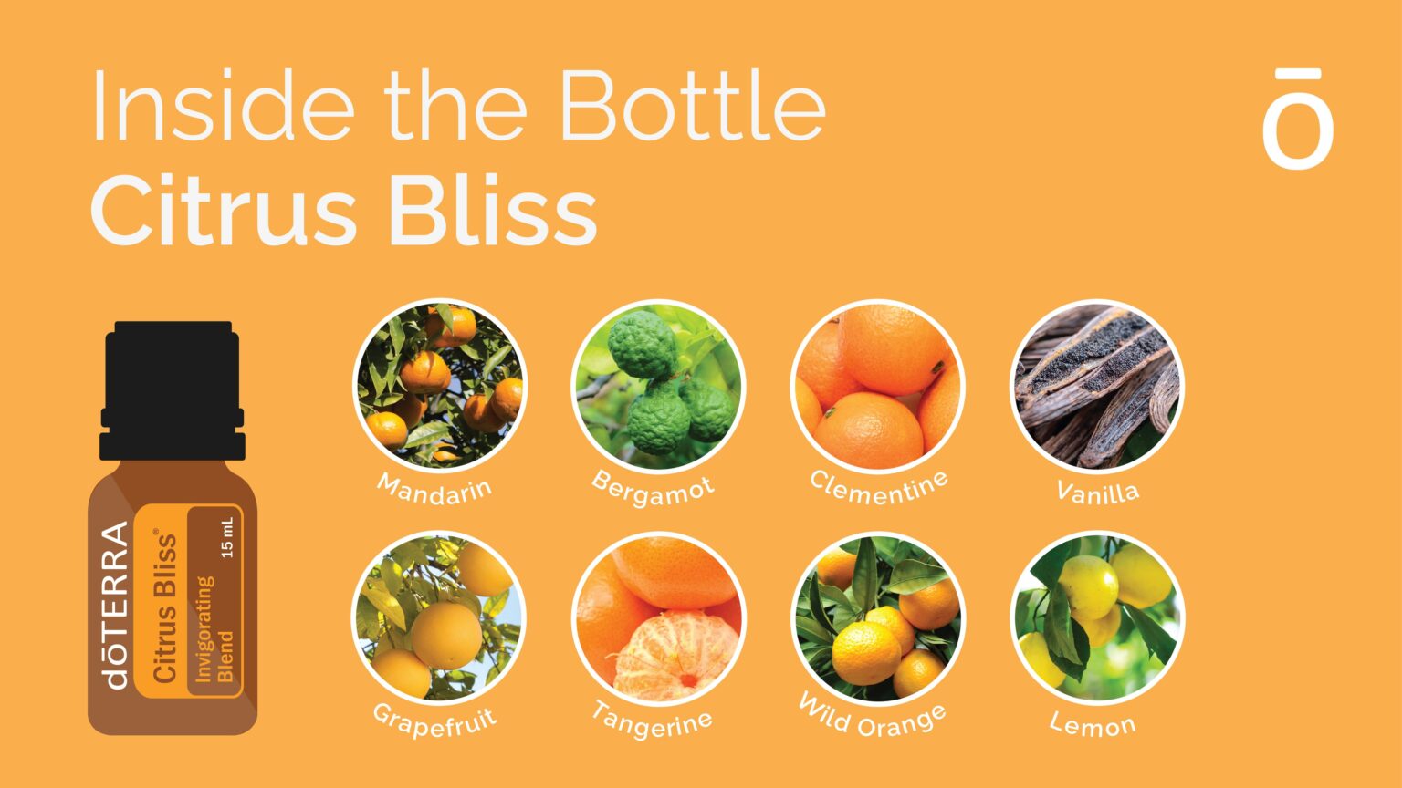 תערובת dōTERRA ®Citrus Bliss היא שילוב מרענן של שמנים אתריים הדריים עם נגיעה חמה של וניל ושעועית טונקה, המספקת תחושת אנרגיה, שמחה ורוגע בו זמנית. כל אחד מהמרכיבים בתערובת מביא עמו איכויות ייחודיות ותועלות טיפוליות.