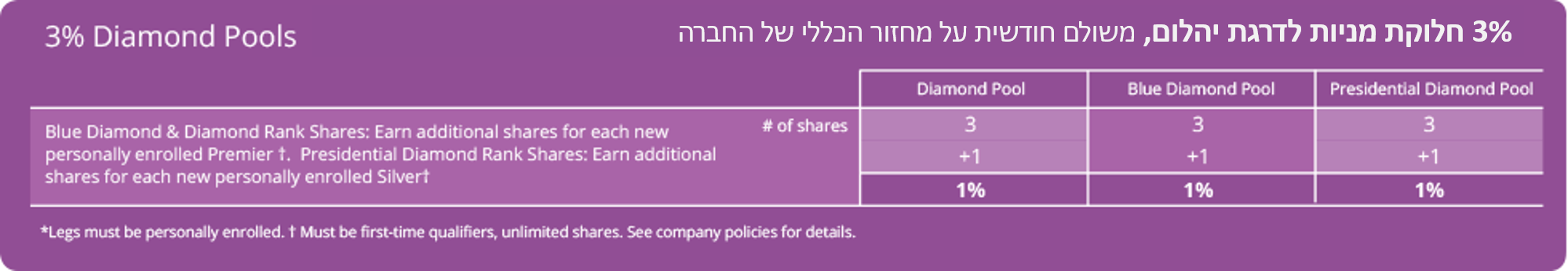 • מחזור קבוצתי/Volume Team של 600 PV ומעלה. הנפח הקבוצתי כולל הזמנות אישיות שלך, והזמנות של מי שרשום ישירות תחתייך בשורה הראשונה שלך: מפיצים ולקוחות.