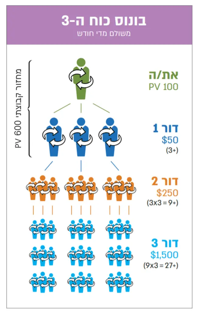 כוח ה-3 תוכנן לעזור למפיצים לבנות ולארגן את העסק שלהם באופן יעיל. ישנן שלוש רמות שונות של בונוס שניתן להרוויח, כאשר כל רמה מבוססת על הרמה שתחתיה. המפתח הוא לעזור לכל אחד מחברי הצוות שלך להרוויח את הבונוס בעצמו, וכך תוכל להתקדם לעבר הדרגה הגבוהה יותר של הבונוס!