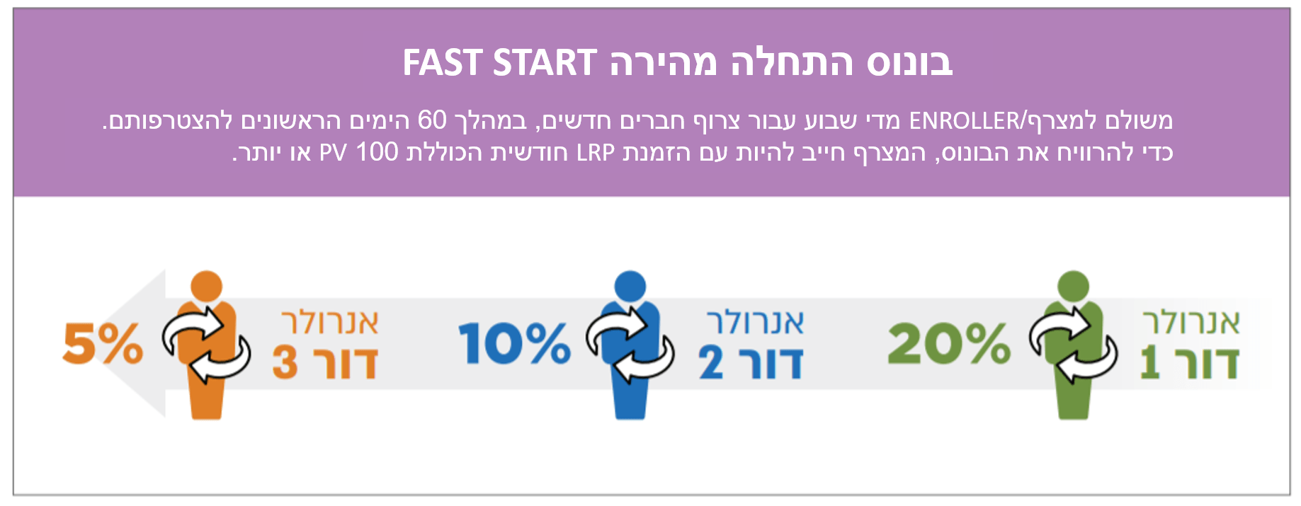 המצרף ירוויח 20% מערך ההזמנות/ CV של כל הזמנה שהמצטרף החדש יבצע במהלך 60 הימים הראשונים להצטרפותו.