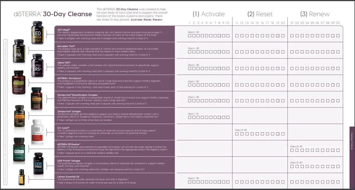 דוטרה מציעה תכנית ניקוי והתחדשות של 30 ימים, שמטרתה להפחית את העומס הרעיל ולשפר את תפקוד האיברים החיוניים והיא כוללת את המוצרים הבאים שתומכים בשלושה שלבים חשובים לתהליך הדיטוקס.