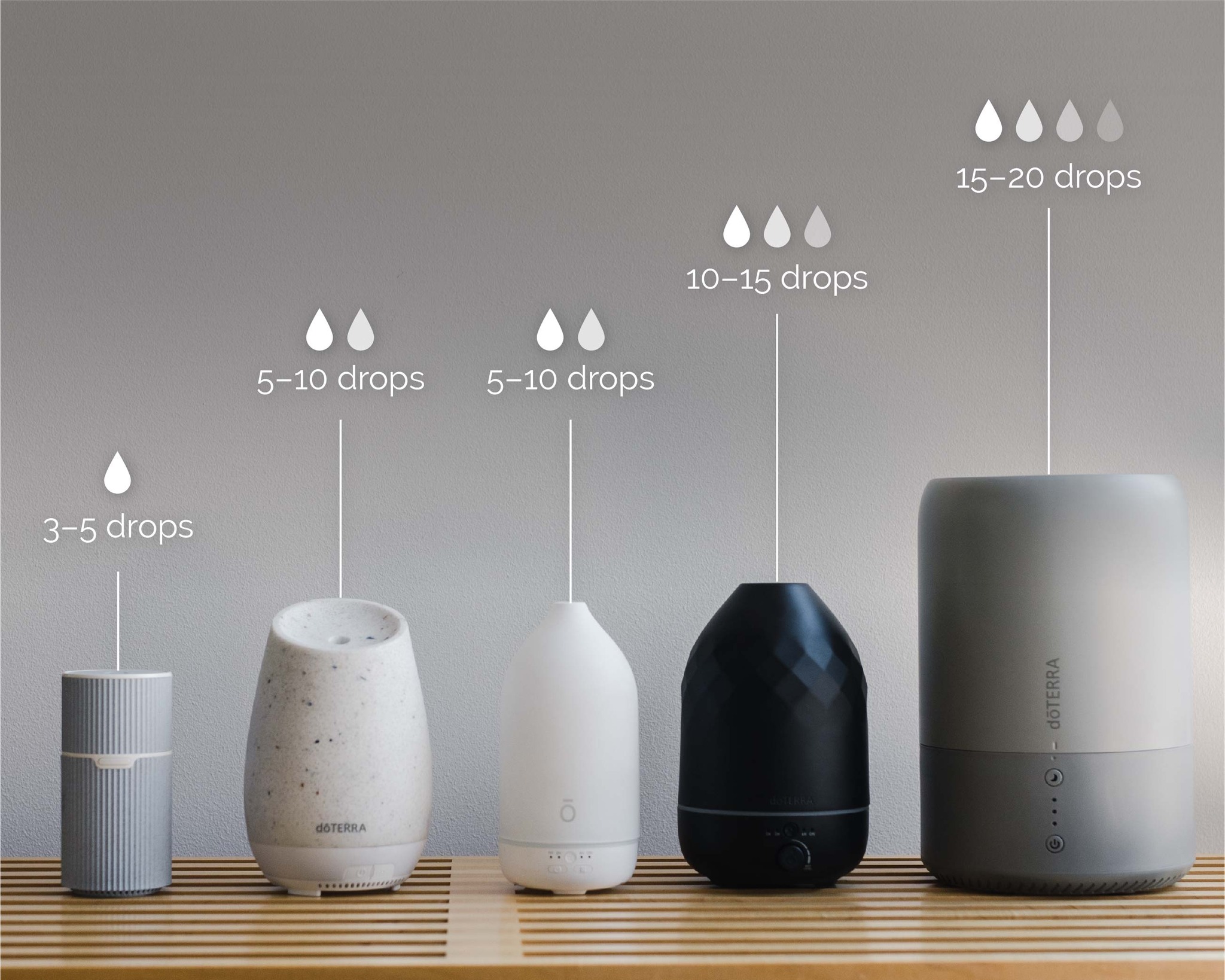 לדיפיוזרים של dōTERRA זמני פעולה ושטחי כיסוי שונים. חלקם מותאמים לשטחים גדולים כמו אזורי כינוס, בעוד אחרים מכסים שטח קטן יותר בעוצמה מרוכזת. אם ברצונכם ליצור אווירה שמחה במטבח, למשל, בחרו בדיפיוזר שמכסה שטח נרחב.