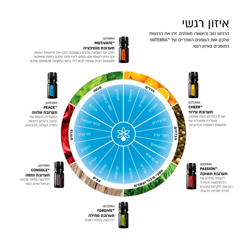 - איזון רגשי: השתמשו בארומה ובמריחה כדי לעבור ממצב כבד-לב למצב שמח ומאוזן.