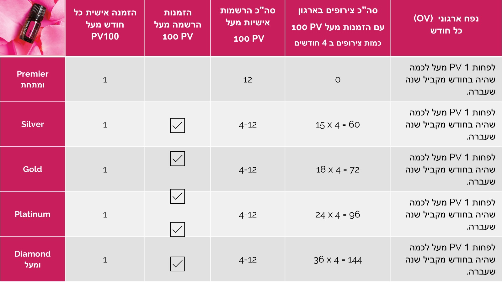 בכל חודש יש לבצע הזמנת נאמנות אחת (LRP) בנפח של לפחות 100 נקודות PV.